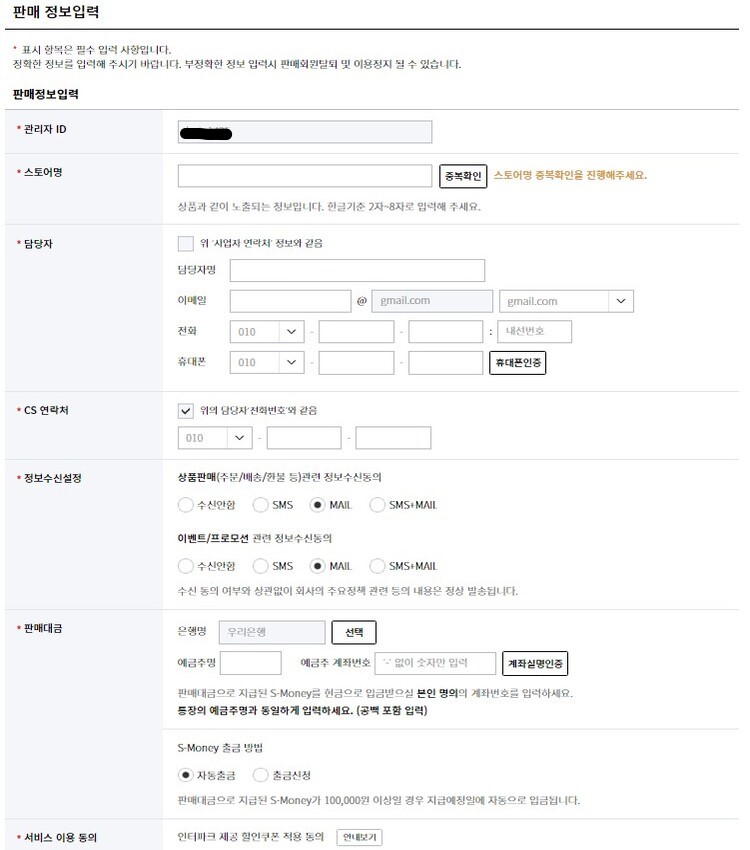 | 1. 오픈마켓 판매자 가입 2. 판매자 회원가입 - 약관동의 3. 판매자 회원가입 - 정보입력 4. 사업자 정보 입력 5. 판매 정보입력 6. 가입완료 |