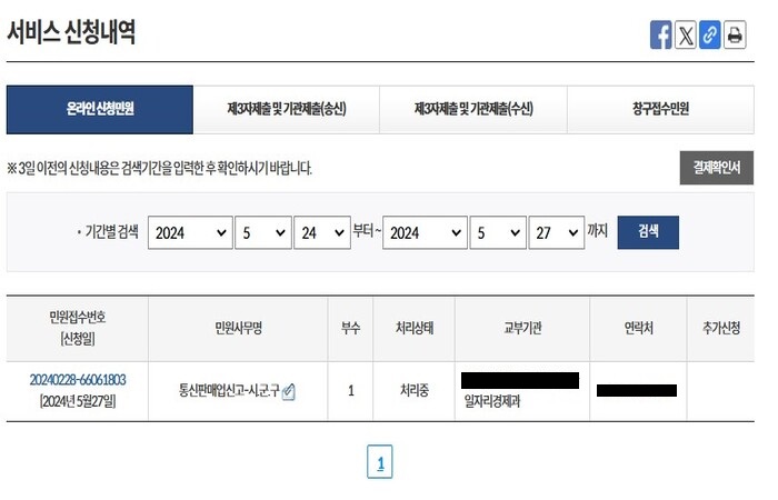 | 1. 정부 24 로그인 2. 통신판매업 발급하기 3. 서비스 신청 내역 확인하기 |