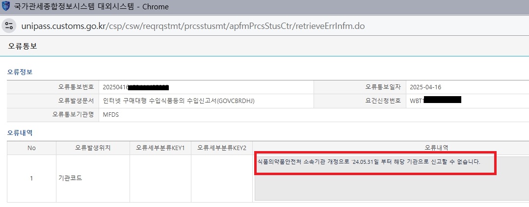 - 신고기관코드 관할 세관 (예: 인천국제공항수입식품검사소)