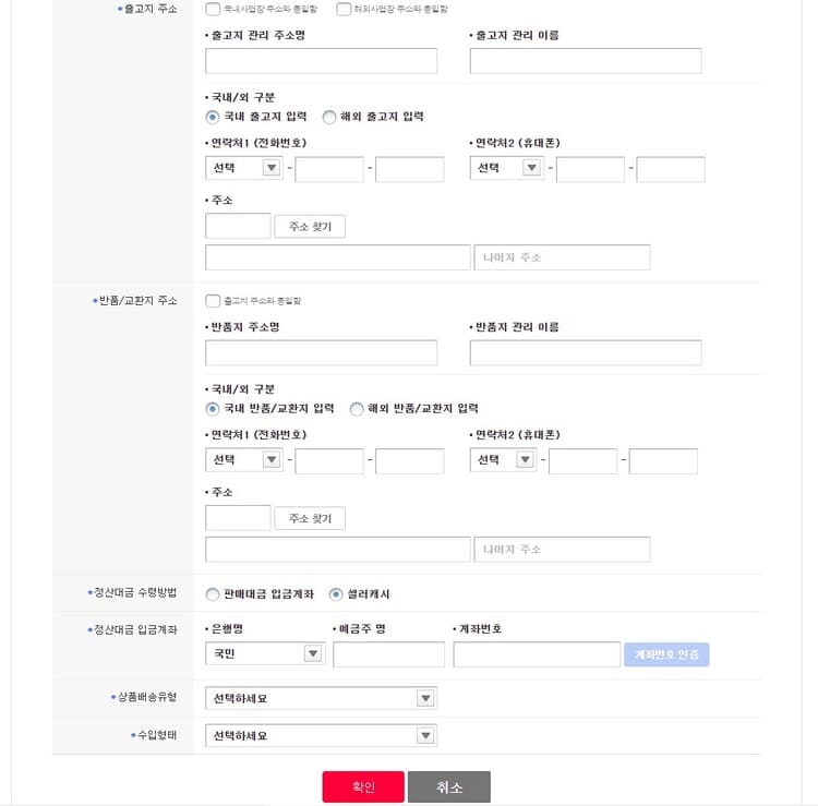 - 출고지 : 해외출고지 선택(주소명:타오월드, 출고지관리 이름:타오월드 배대지) 입력